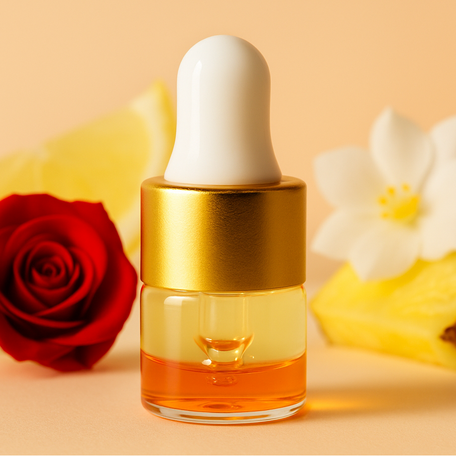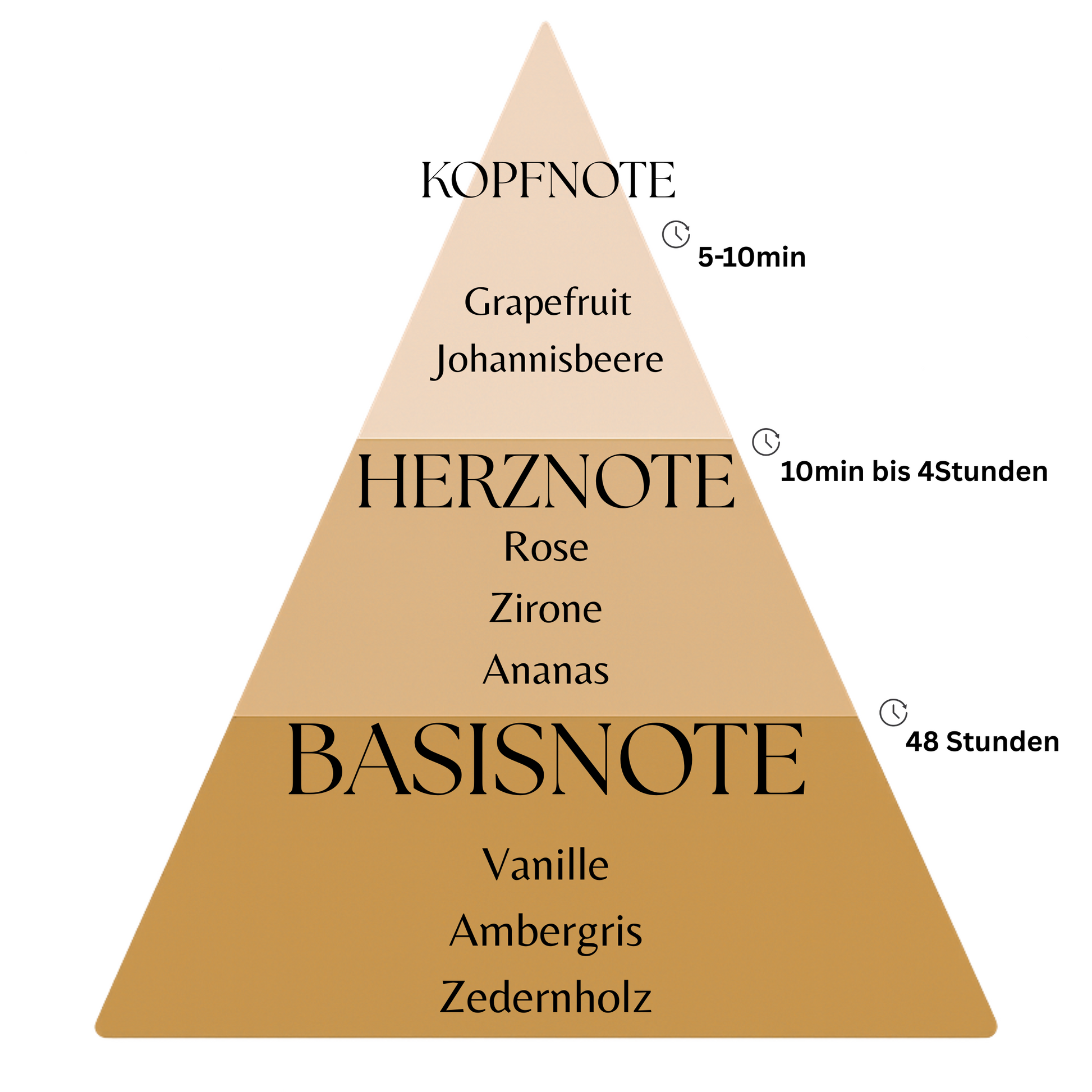 Rose, Zitrone und Ananas entfalten eine lebendige Mitte, die verspielte Fruchtigkeit mit floraler Eleganz kombiniert. Wie ein sonniger Spaziergang durch einen exotischen Garten – vital und leicht zugleich.