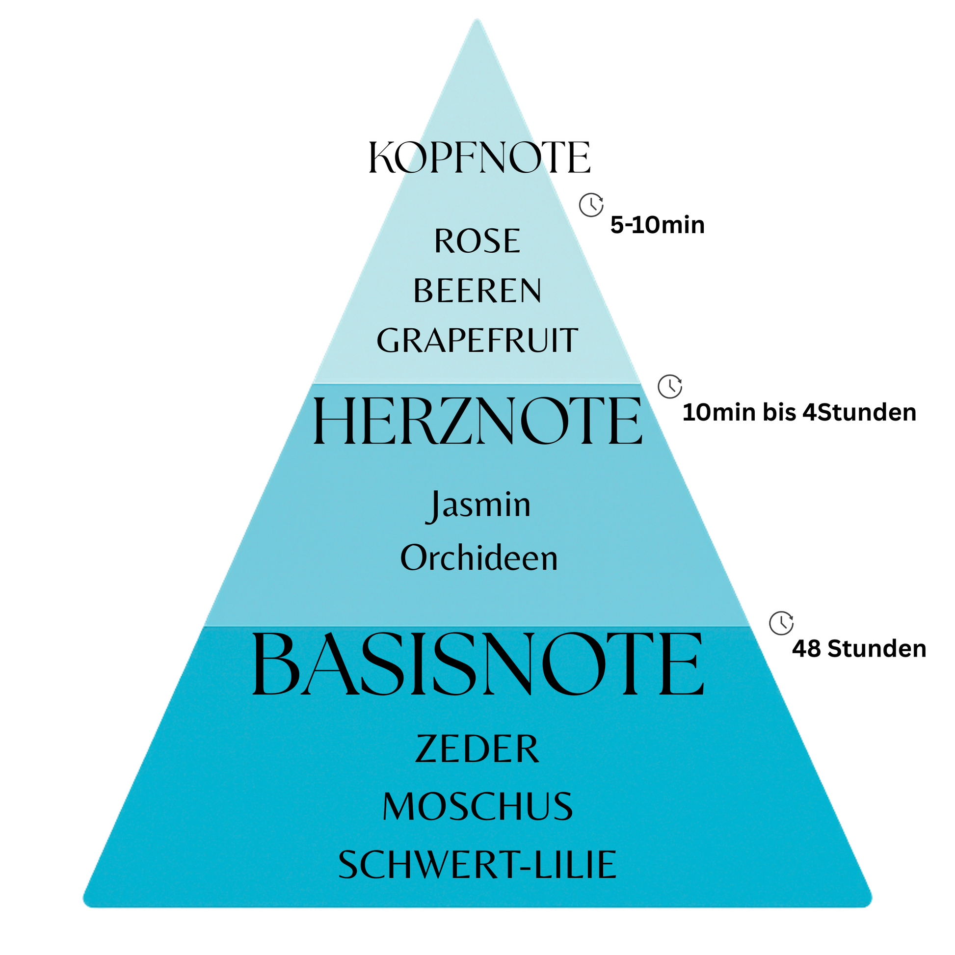 Moschus, Iris und Zedernholz sorgen für eine warme, beruhigende Tiefe. Sie verleihen dem Duft eine luxuriöse, langanhaltende Note mit ruhiger Kraft und charmanter Sinnlichkeit.